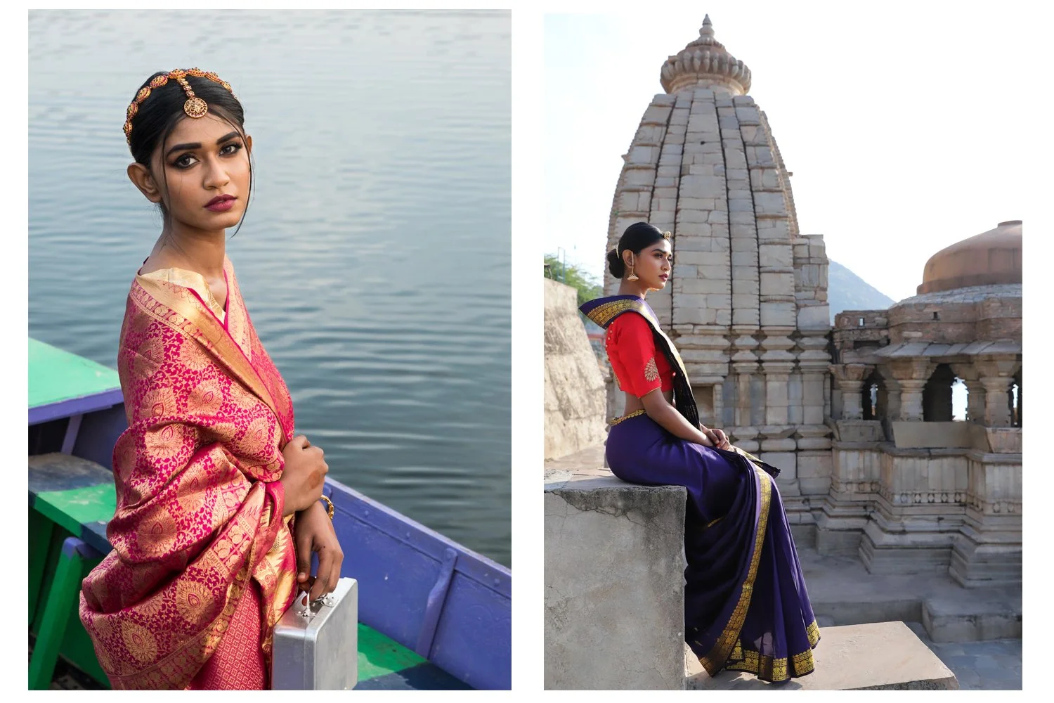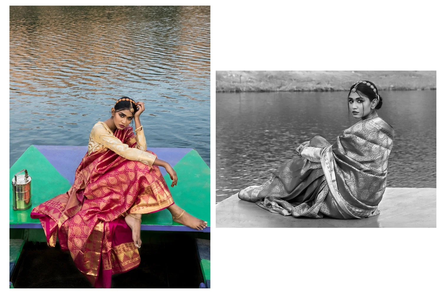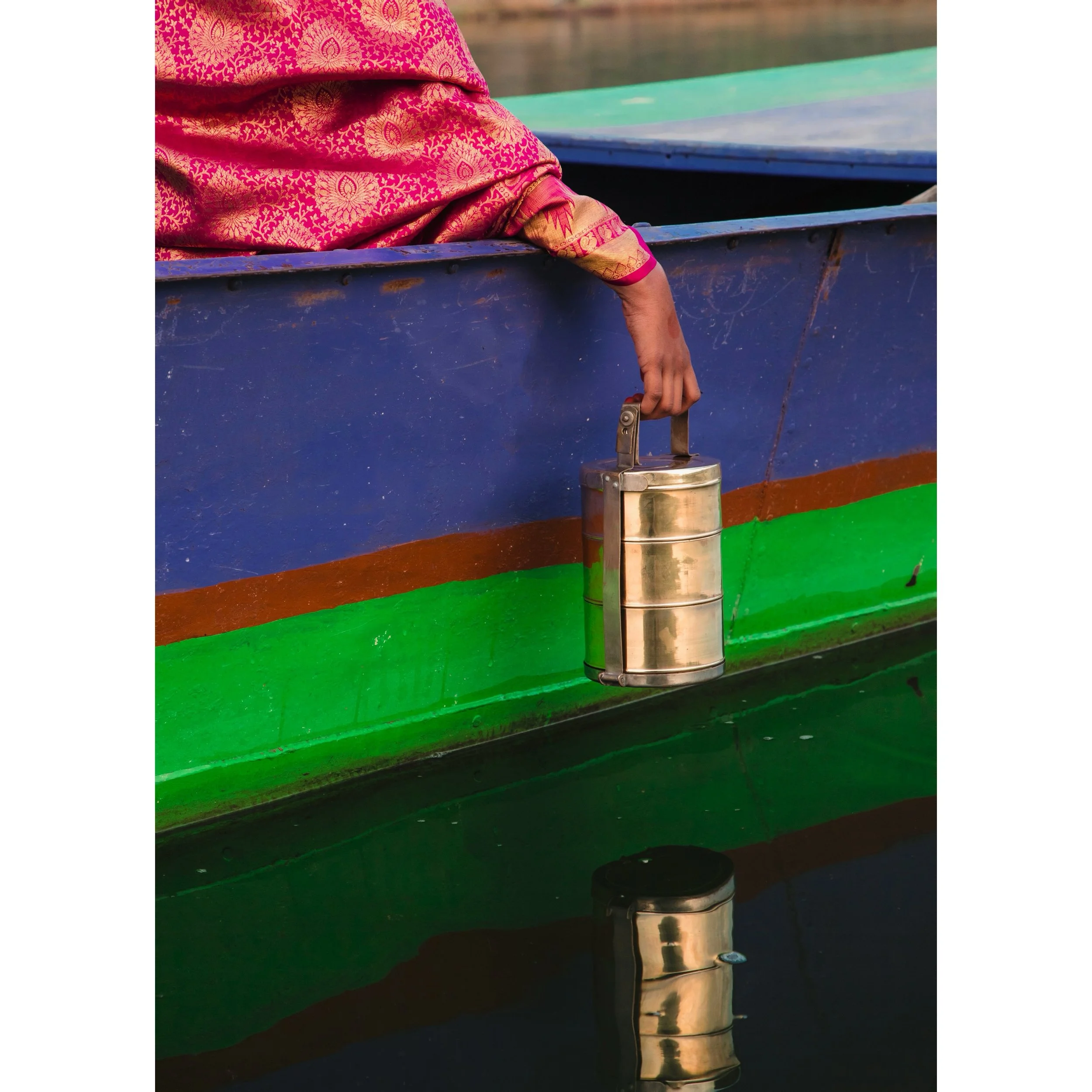 I have a profound eagerness to connect life with pictures and vise-versa. Weaving narratives to the art I create is always my intense desire. When I decided to perform few test shoots for my portfolio, which by the way holds a great importance in any stylist’s life, I started collecting things and thoughts that strike a chord within me. One of the foremost was my mother’s sarees. I would like to believe that there is an undeniable force of love that rushes to every Indian girl’s heart for her mother’s trousseau especially her meticulously preserved sarees through ages. So there I was, perusing through my mom’s hidden cupboard standing at the extreme corner of our house inside the storage room. Then came the पेटी (my grandmother’s old silver box) with a hook to put separate locks. It bore the marks of countless journeys where she use to secure her jewellery and money in this डब्बा (Box). It was literally passed down to us as an inheritance from my grandmother. Further I found this bygone era tiffin box in yet another hidden kitchen treasure of my mom. And here I was, sitting and starring at these pieces fancifulizing my shoot.